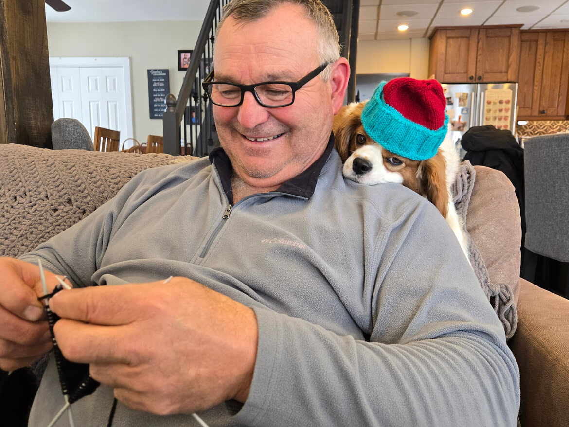 “I don’t knit in the summer, because my hands smell like manure all the time,” Larry says, who says he has already built up a callous from the knitting. Thank goodness, because he had injured his thumb in an airbrake several years back and he couldn’t find a thimble big enough to protect it, he laughs. At least for this winter, you’ll find Larry cozy on the couch with Diesel, just knitting away. ◊